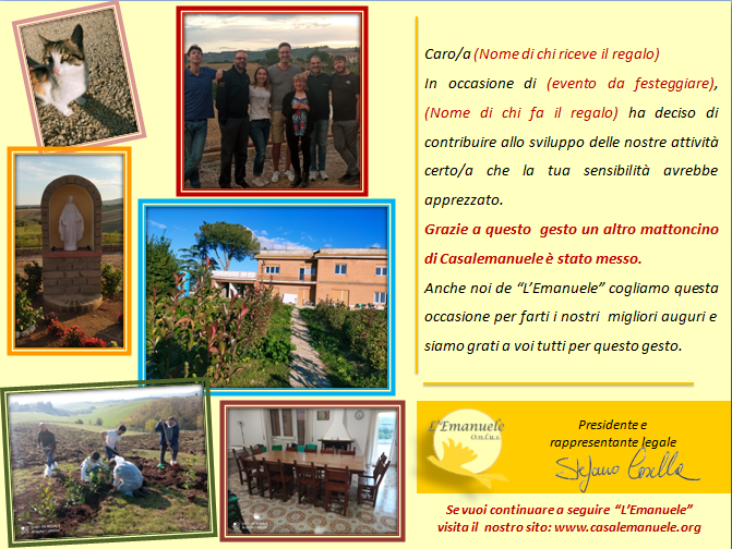 In occasione di un compleanno, di una ricorrenza speciale, di una festività, fai degli auguri che donano aiuto e speranza a chi ha bisogno. Il tuo regalo si trasformerà in piccolo mattoncino che farà felice la persona che riceverà il tuo regalo e tante altre che potranno godere quanto prima di "Casalemanuele".